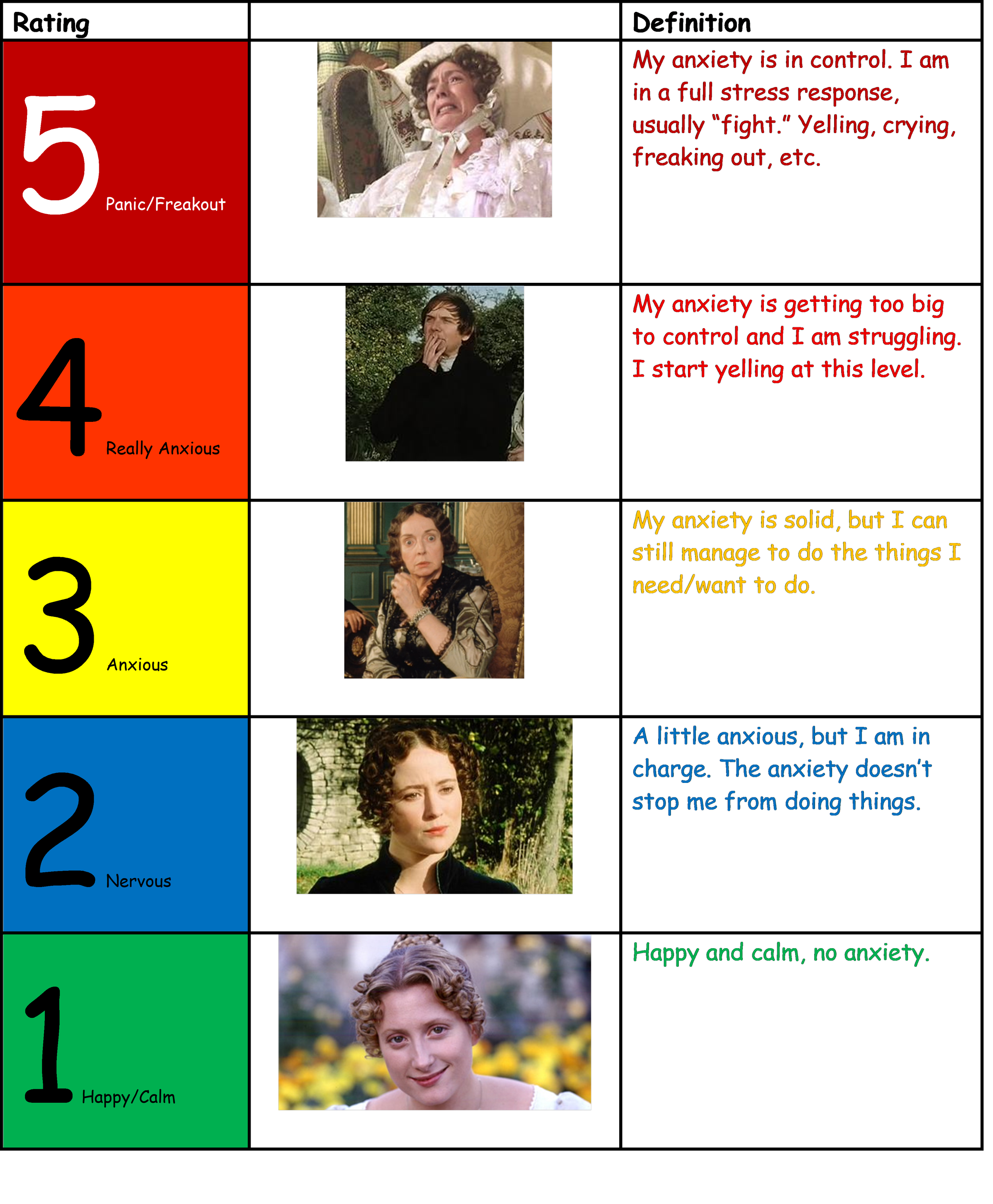 Likert scales are a useful tool for rating things like mood or pain levels. For autistic people however, they can be a problem as the scales often do not make sense to us. I remember when I was giving birth to my first child, the nurses kept asking me my pain level. They were using a scale that was color coded and had smiley faces that depicted happy to very unhappy on a scale of 1-10. I told them I didn’t understand, and the nurses tried to explain the pain scale to me, saying that 1 was no pain and 10 was the worst pain I had ever felt, like a C-section with no anesthesia. This was very unhelpful as I had never had a C-section with no anesthesia. They changed level 10 to, “the worst pain you’ve ever felt.” At this point in my 28 years, I had never broken a bone, never had stitches, and so my current labor pain WAS the worst pain I had ever felt. (I had had my tonsils out at age 4, but that pain was a distant memory). I kept giving high ratings and they kept trying to push an epidural, which I was trying to avoid. My commitment to my plan of having a natural birth, along with support from my husband, helped me have the natural birth I had wanted, but I decided at that moment that Likert scales just didn’t work for me (I didn’t know why, i.e. because I am autistic, until much later).